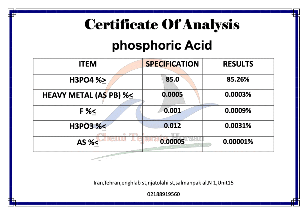 اگه دنبال یه تأمینکننده مطمئن برای اسید فسفریک هستید که هم کیفیت بالا ارائه بده، هم قیمت رقابتی، و هم همیشه در دسترس باشه، شیمی تجارت هورسان بهترین انتخاب شماست.